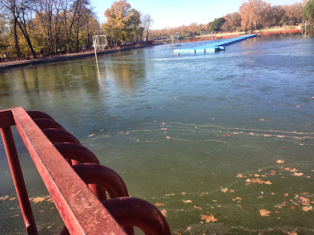 Esta mañana me levanto temprano, desayuno fuerte, hago algo de tiempo y salgo a la calle... que frío!! Me acerco a la Casa de Campo y me encuentro la fuente y el lago congelados